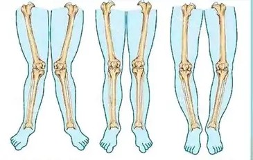 X型腿(膝外翻) 表现为双腿并拢站立时,双膝内侧相互接触,而双脚踝无法靠拢,呈“X”形。多发于儿童发育期,成人则可能由退行性病变、外伤或代谢性疾病引起。